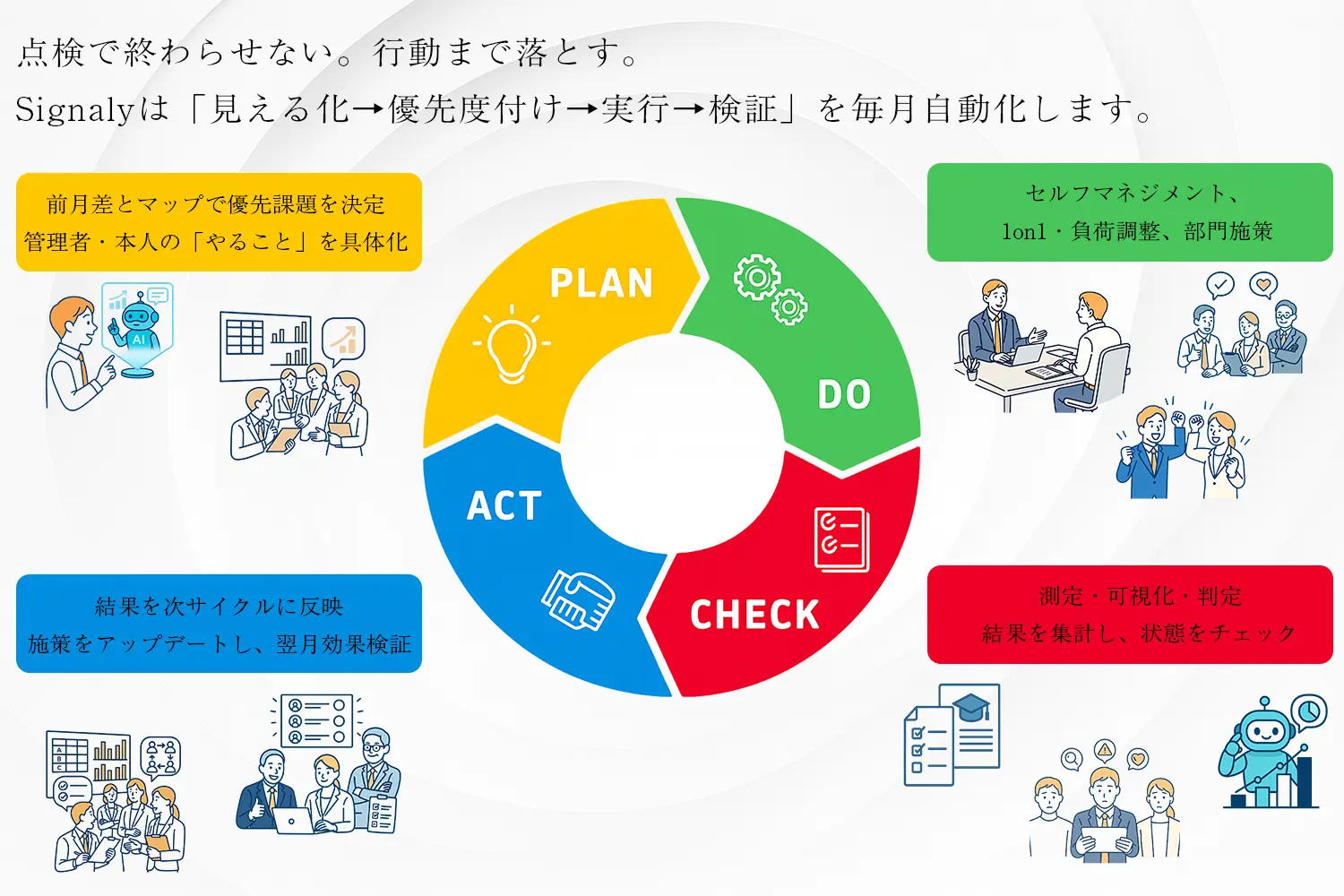 上長には、「誰に、いつ、何を」、本人にはセルフケアと学習ヒントを提示し、翌月に効果検証まで回します。